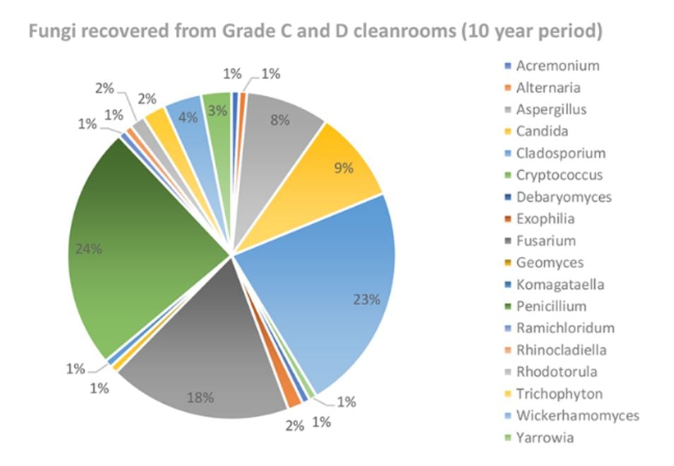 The most frequent fungal contaminants, identified by Tim Sandle and shown in Figure 1 below, included Fusarium sp., Cladosporium sp., and Penicillium sp., with Aspergillus sp. close behind.
